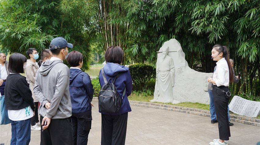 參觀的第二站是竹園,一走進竹園,“竹未出土先有節(jié)”這句漢白玉雕刻的詩詞在郁郁蔥蔥的竹林掩映下十分醒目。園區(qū)分為“頌竹”“品竹”“聽竹”“知竹”,完美地將“景”與風清氣正的“廉”融合,構(gòu)成“半山半水半竹林”的雅致景色。在參觀過程中,講解員向大家訴說著古代清官廉吏的典故,感受著先輩們剛正廉明的優(yōu)秀品質(zhì),也體會到古往今來的“廉竹精神”。