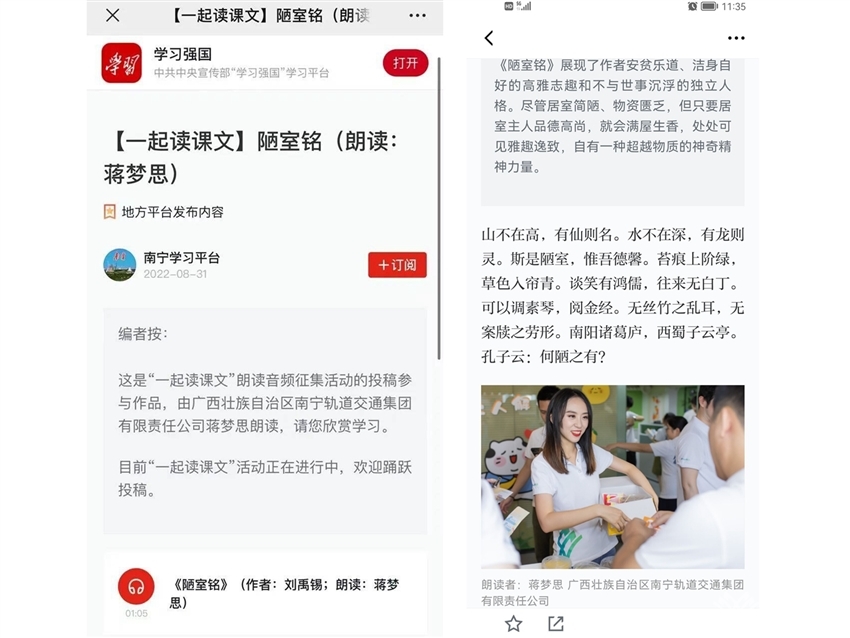 軌道地產(chǎn)商業(yè)公司黨支部蔣夢思同志參加了此次活動,她朗讀的作品《陋室銘》經(jīng)南寧軌道交通集團推選,榮登“學習強國”平臺,在“一起讀課文”欄目展播。